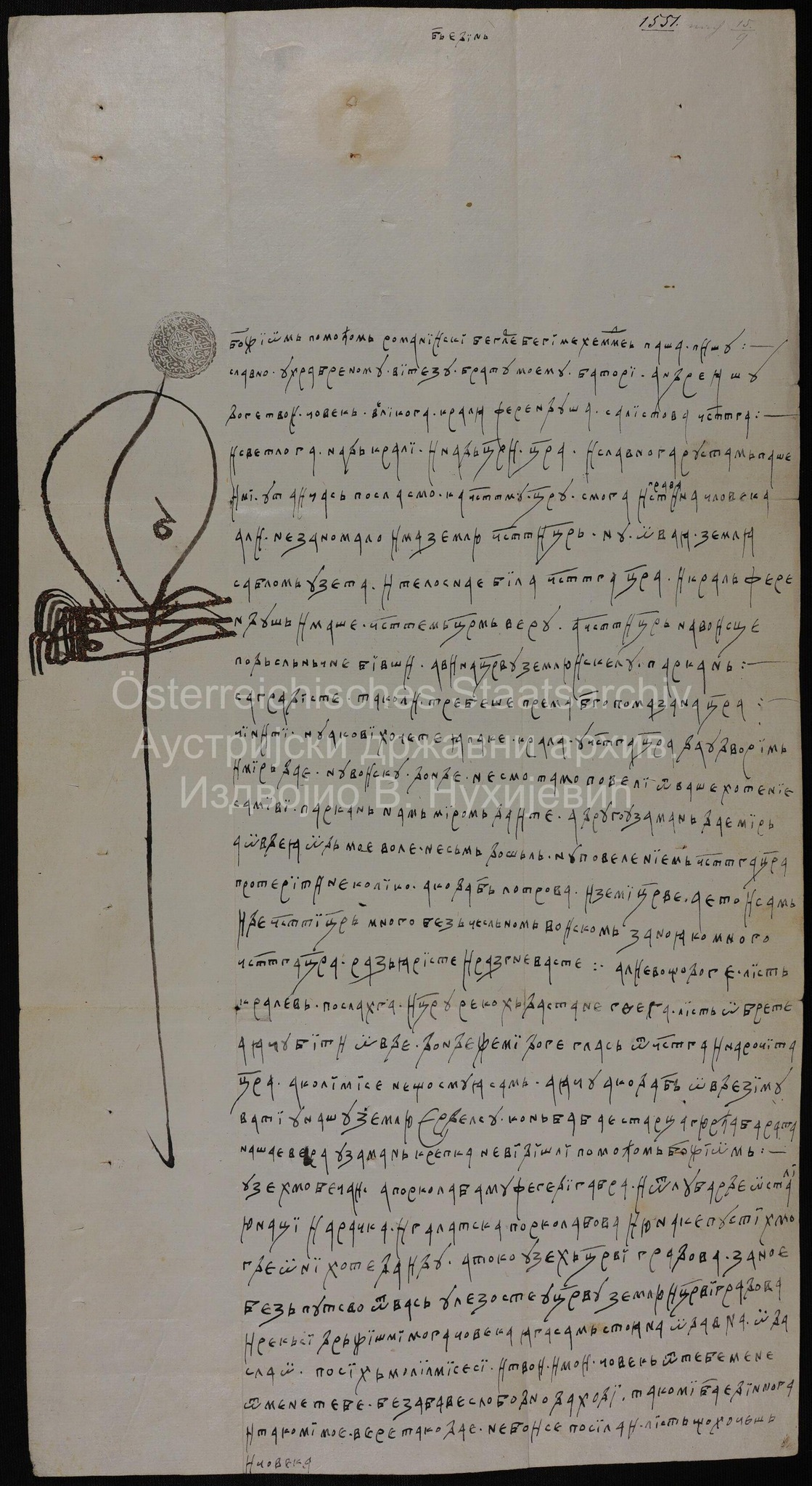 Божијом помоћу, ја, румелијски беглербег Мехмед-паша, пишем славно ухрабреному витезу, моме брату, Андрашу Баторију. Дође твој човек, великога краља Фердинанда, са листовима за честитога и светлога, над краљевима и царевима, цара, и славнога Рустам-пашу. И ми, у тај час посласмо честитомe цару свога правога човека. Али, не зато што мало земље има честити цар, већ зато што је ова земља сабљом узета, и телосна је била у честитога цара. И краљ Фердинанд имаше са честититим царем веру, а честити цар у рату беше под Солночком тврђавом, а ви на царевој земљи саградисте скелу Паркањ. Тако ли треба чинити богопомазаном цару? Ипак, ако хоћете да удворим краља код честитог цара, и мир да је, док нисмо тамо војску повели, вашом вољом сами нам миром дајте Паркањ, а за друго узалуд да је мир. А ја нисам дошао овде од моје воље, већ наредбом честитог цара да протерам, ако да Бог, неколико лотрова из цареве земље. И ето, честити цар сам иде са безбројном војском зато што га јако много разјаристе и разгневисте. Али ево, пошто дође лист краљев, послах га и цару рекох да стане где га лист затекне, а ја ћу бити овде докле ми дође вест од честитог и нарочитог цара. Ако ли ми се самом нешто помути, а ја ћу, ако да Бог, овде зимовати у нашој земљи ердељској код бабаје старца Ђурђа Барата. Наша је вера узалуд тврда. Не видиш ли, божјом помоћу узесмо Бечеј, порколаба му Фегеди Габра, и од лубарде остали јунаци, и арачке и галатске порколабе и јунаке пустисмо да иду где они хоће. А тако узех цареве градове због вашег зла, зато што уђосте у цареву земљу и цареве градове. И рекавши да држиш мога човека, ја сам Стојана одавно одаслао. За ово молио ми се и твој и мој човек: од тебе мени, од мене теби без сметње слободно да ходи. Тако ми јединога Бога и тако ми моје вере, нека буде тако. Не бој се, пошаљи лист шта хоћеш и човека.